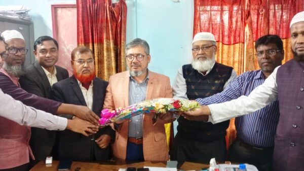 প্রধান শিক্ষককে ফুলের শুভেচ্ছা দিলেন সহকারী শিক্ষকগণ