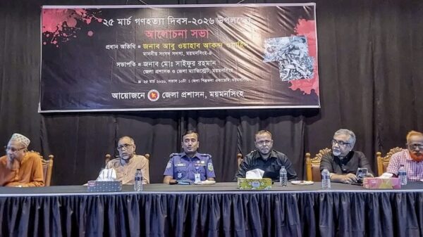 ময়মনসিংহে জেলা প্রশাসনের আয়োজনে গণহত্যা দিবস উপলক্ষ্যে আলোচনা সভা অনুষ্ঠিত