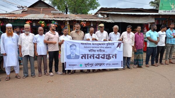 নেত্রকোনা প্রতিনিধি: গাজীপুরে সাংবাদিক আসাদুজ্জামান তুহিন হত্যাকান্ডের দৃষ্টান্তমূলক শাস্তির দাবীতে নেত্রকোনায় মানববন্ধন কর্মসূচি পালিত হয়েছে। জেলার সীমান্তবর্তী উপজেলা দুর্গাপুরে রোববার বেলা বারোটায় দুর্গাপুর প্রেসক্লাবের আয়োজনে পৌর শহরের প্রেসক্লাব মোড়ে ঘন্টাব্যাপি