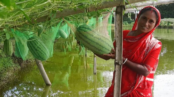 ডুমুরিয়ায় মহিলা তরমুজ চাষী বিপাশা গাইনের বাম্পার ফলনে তার মুখে হাসি