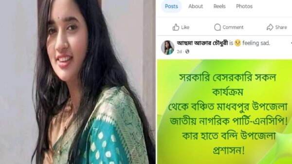 (মো ইপাজ খাঁ বিশেষ প্রতিনিধি) হবিগঞ্জের মাধবপুর উপজেলা প্রশাসনের সরকারি-বেসরকারি কার্যক্রম থেকে জাতীয় নাগরিক পার্টি (এনসিপি)-এর নেত্রী ও উপজেলা প্রধান সমন্বয়কারী আসমা আক্তার চৌধুরীকে বঞ্চিত রাখার অভিযোগ উঠেছে। এ ঘটনায়