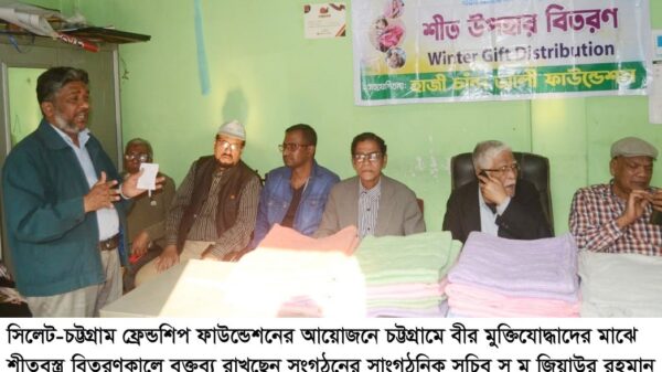 স ম জিয়াউর রহমান, চট্টগ্রাম থেকে :সিলেট-চট্টগ্রাম ফ্রেন্ডশীপ ফাউন্ডেশনের উদ্যোগে ও হাজী চাঁন্দ আলী ফাউন্ডেশনের সহযোগিতায় ১২ জানুয়ারি, সোমবার, বিকাল চারটায় নগরীর পশ্চিম খুলশী জালালাবাদ হাউজিং সোসাইটির মুক্তিযোদ্ধা কলোনীতে বীর