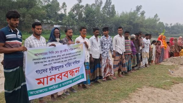 মোঃ শামীম হোসেন, স্টাফ রিপোর্টার। জামালপুরের মাদারগঞ্জের নলছিয়া গ্রামে পৈত্রিক সম্পত্তি দখল, চাঁদাবাজি ও সন্ত্রাসী কর্মকাণ্ডের প্রতিবাদে এবং অভিযুক্তদের দৃষ্টান্তমূলক শাস্তির দাবিতে মানববন্ধন করেছে স্থানীয় এলাকাবাসী। সোমবার সকালে নলছিয়া গ্রামে
