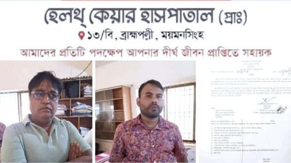 মকবুল হোসেন, স্টাফ রিপোটার ময়মনসিংহ জেলা অতিরিক্ত পুলিশ সুপার ক্রাইম মোঃ আব্দুল্লাহ আল মামুন নগরীর হেলথ কেয়ার প্রা: হাসপাতালের মালিকসহ ৩জনকে প্রাথমিক জিজ্ঞাসাবাদের জন্য আটক করে কোতোয়ালী মডেল থানায় সোর্পদ