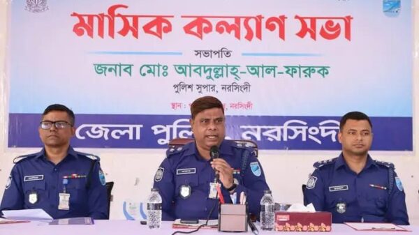 মোঃ মোবারক হোসেন নাদিমস্টাফ রিপোর্টার নরসিংদী পুলিশ লাইন্সে জেলা পুলিশ, নরসিংদীর মাসিক কল্যাণ সভা অনুষ্ঠিত হয়। সভায় সভাপতিত্ব করেন নরসিংদী জেলার সম্মানিত পুলিশ সুপার জনাব মোঃ আবদুল্লাহ্-আল-ফারুক। সভায় বিভিন্ন পদবীর