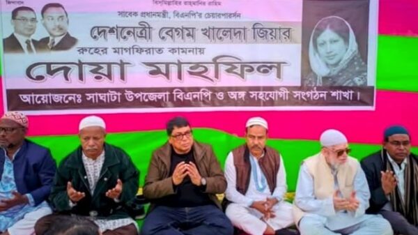 মোঃ মেহেদী হাসান স্টাফ রিপোর্টারঃ গাইবান্ধার সাঘাটায় সাবেক প্রধানমন্ত্রী বিএনপি’র প্রয়াত চেয়ারপার্সন মরহুমা বেগম খালেদা জিয়ার রুহের মাগফেরাত কামনায় দোয়া মাহফিল অনুষ্ঠিত হয়েছে। গতকাল শুক্রবার জুমার নামাজ আদায় শেষে সাঘাটা