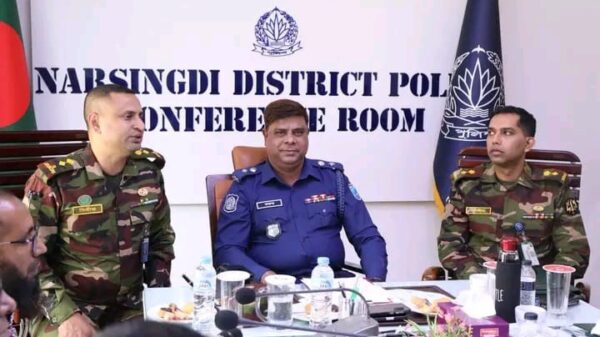 মোঃ মোবারক হোসেন নাদিমস্টাফ রিপোর্টার, ত্রয়োদশ জাতীয় সংসদ নির্বাচন-২০২৬ উপলক্ষে নরসিংদী পুলিশ সুপারের সম্মেলন কক্ষে বাংলাদেশ সেনাবাহিনী, পুলিশ, স্থানীয় প্রশাসন, বিজিবি, র্যাব, আনসার ও ভিডিপি এর কর্মকর্তাগণের অংশগ্রহণে এক সমন্বয়