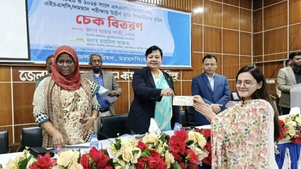 ময়মনসিংহে ২০২৩ ও ২০২৪ সালে এসএসসি/সমমান এবং এইচএসসি/সমমান পরীক্ষায় উত্তীর্ণ কৃতি শিক্ষার্থীদের বৃত্তির চেক বিতরণ করা হয়েছে। আজ১৫ ডিসেম্বর সোমবার ময়মনসিংহ জেলা পরিষদের আয়োজনে ভাষা শহীদ আব্দুল জব্বার মিলায়তনে এ চেক বিতরণী অনুষ্ঠিত হয়। ময়মনসিংহের অতিরিক্ত বিভাগীয় কমিশনার তাহমিনা আক্তারের সভাপতিত্বে অনুষ্ঠানে প্রধান অতিথি হিসেবে উপস্থিত ছিলেন ময়মনসিংহ বিভাগীয় কমিশনার ফারাহ শাম্মী, এনডিসি।