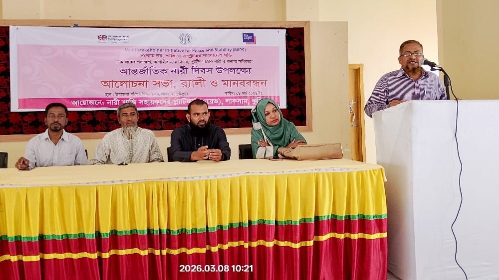 কুমিল্লার লাকসামে আন্তর্জাতিক নারী দিবস উপলক্ষে নারী শান্তি সহায়ক প্ল্যাটফর্ম (ওয়েভ)-এর উদ্যোগে আলোচনা সভা, মানববন্ধন ও র্যালি অনুষ্ঠিত হয়েছে। নারী অধিকার, সমতা ও শান্তিপূর্ণ সমাজ গঠনে নারীর ভূমিকা নিয়ে এ কর্মসূচিতে বিভিন্ন শ্রেণি-পেশার মানুষ অংশগ্রহণ করেন।