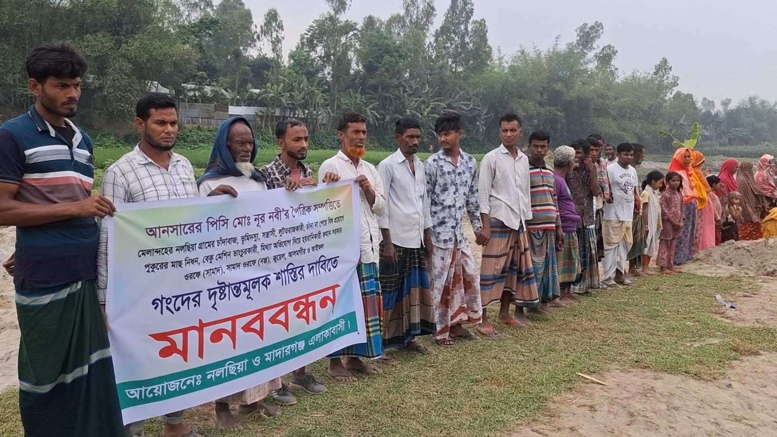 জামালপুরের মাদারগঞ্জের নলছিয়া গ্রামে পৈত্রিক সম্পত্তি দখল, চাঁদাবাজি ও সন্ত্রাসী কর্মকাণ্ডের প্রতিবাদে এবং অভিযুক্তদের দৃষ্টান্তমূলক শাস্তির দাবিতে মানববন্ধন করেছে স্থানীয় এলাকাবাসী।