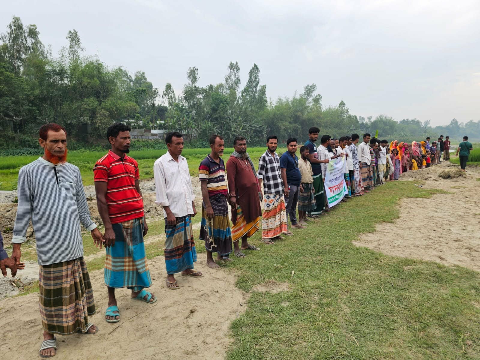 সোমবার সকালে নলছিয়া গ্রামে আয়োজিত এ মানববন্ধনে শতাধিক নারী-পুরুষ অংশগ্রহণ করেন।